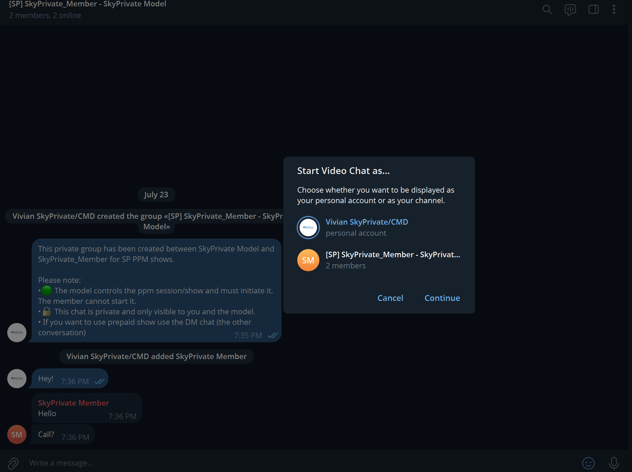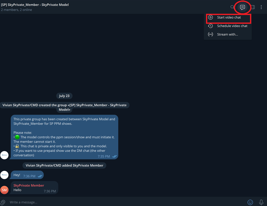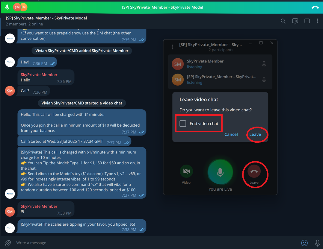 - No elimines bajo ninguna circunstancia el chat grupal creado entre tú y el miembro por el bot de SkyPrivate. Eliminar este grupo puede interrumpir el sistema de Pago por Minuto e impedir que el miembro te llame durante un máximo de 24 horas. Para garantizar una comunicación fluida y oportunidades de ganar dinero sin interrupciones, mantén siempre activo el chat grupal, incluso si no estás chateando.